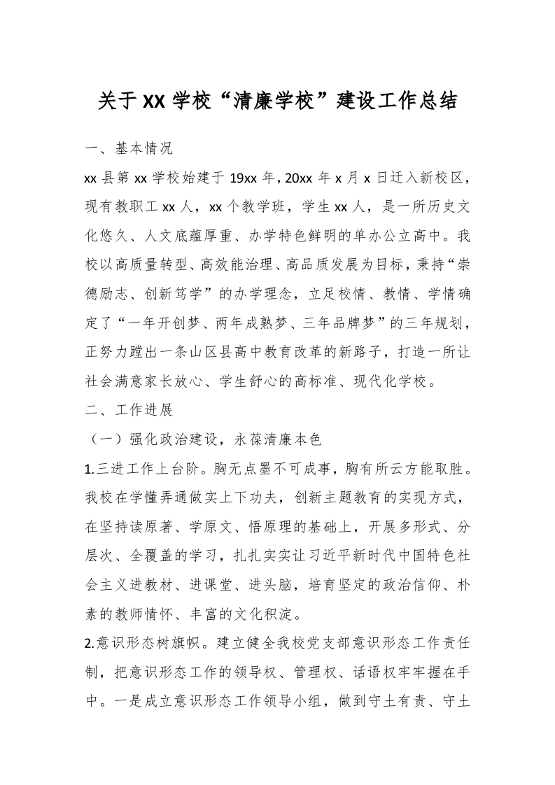 / 关于XX学校“清廉学校”建设工作总结