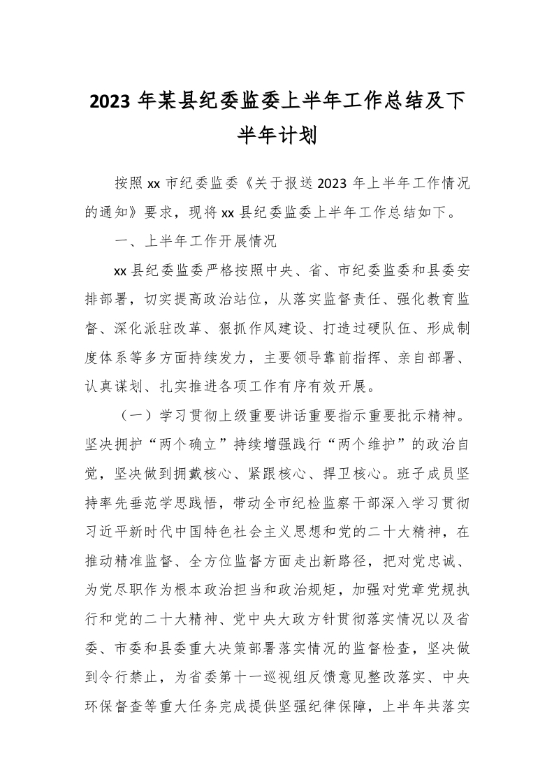 / 2023年某县纪委监委上半年工作总结及下半年计划