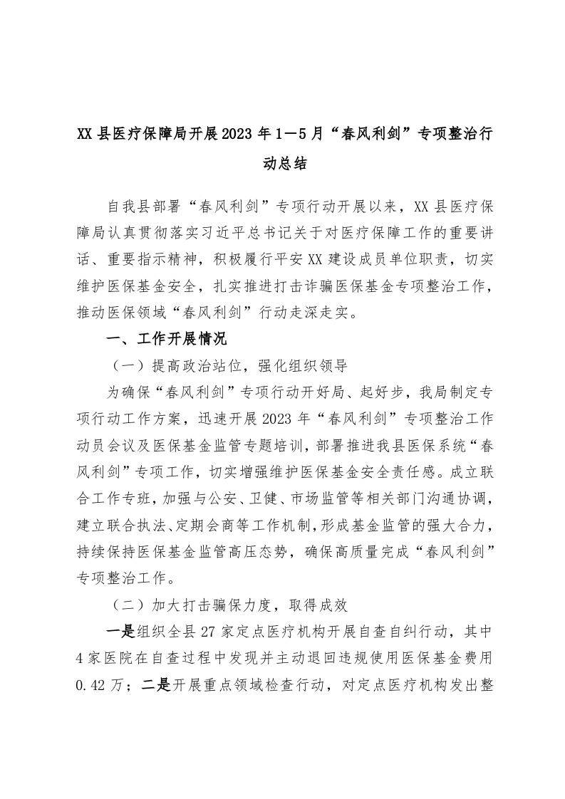 / XX县医疗保障局开展2023年1-5月“春风利剑”专项整治行动总结