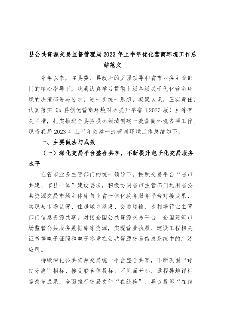 / 县公共资源交易监督管理局2023年上半年优化营商环境工作总结(汇报报告)