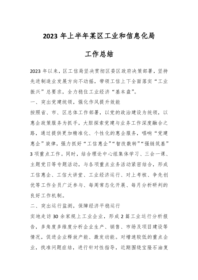 / 2023年上半年某区工业和信息化局工作总结