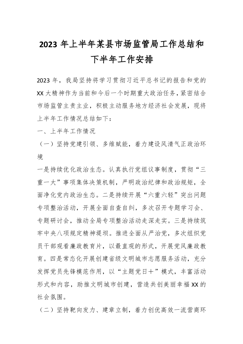 / 2023年上半年某县市场监管局工作总结和下半年工作安排