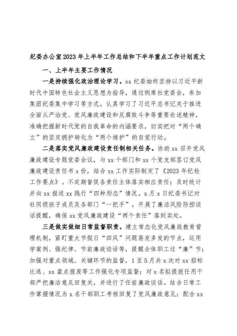 / 纪委办公室2023年上半年工作总结和下半年计划(汇报报告)