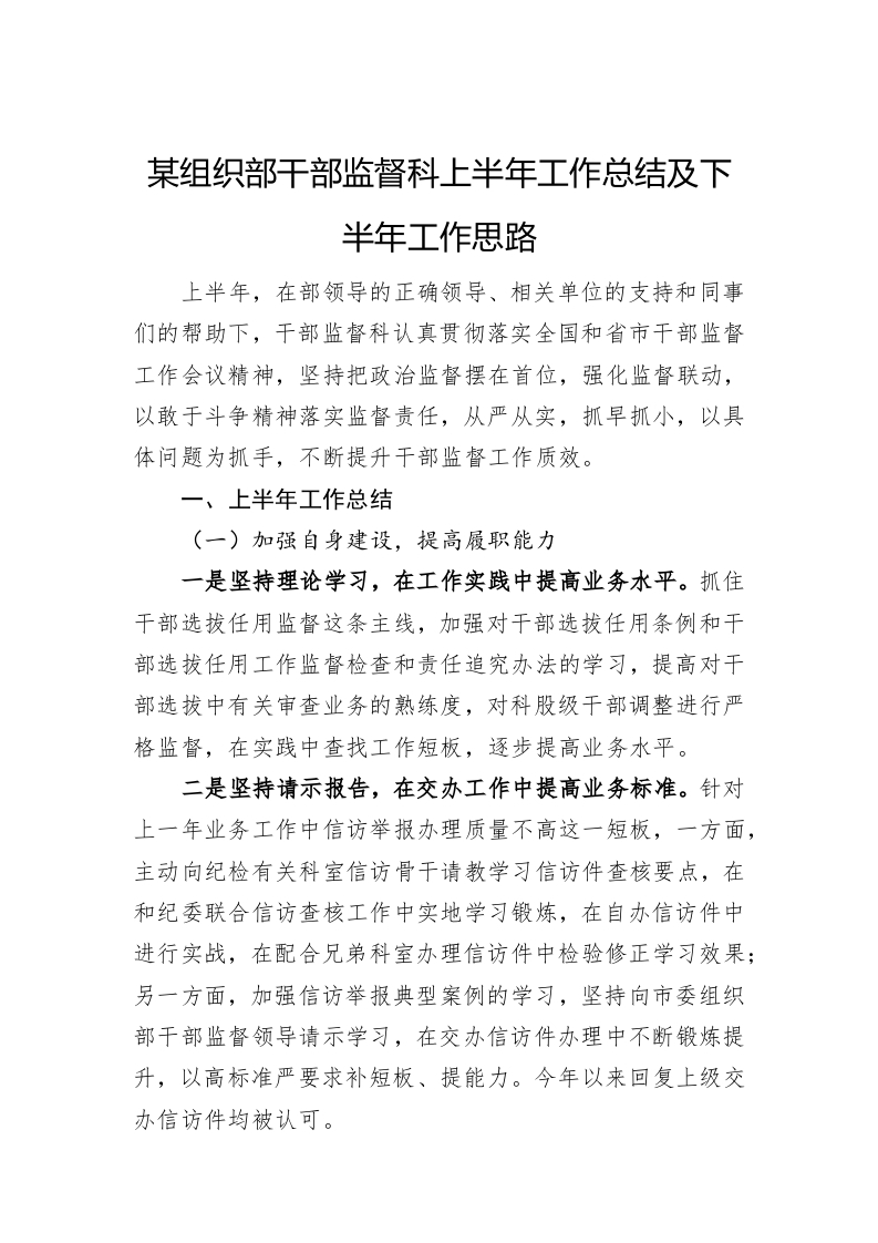 / 某组织部干部监督科上半年工作总结及下半年工作思路