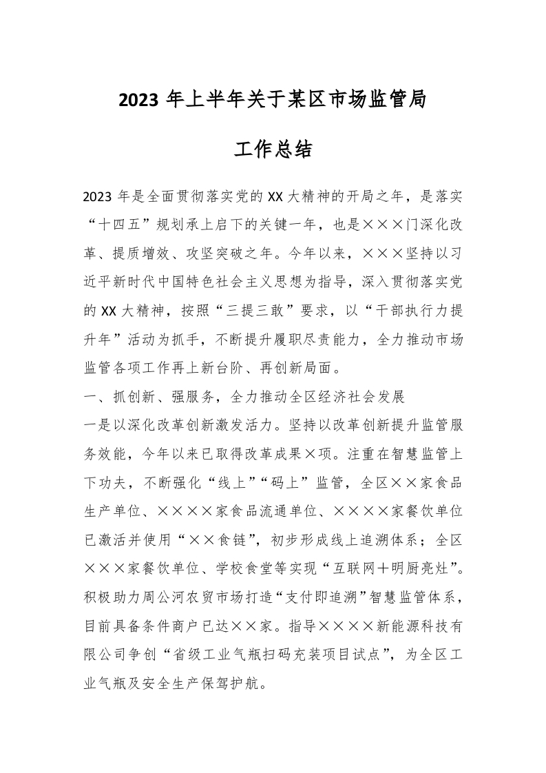 / 2023年上半年关于某区市场监管局工作总结