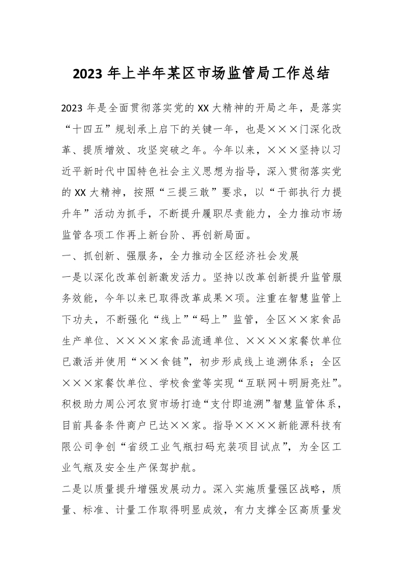 2023年上半年关于某区市场监管局工作总结