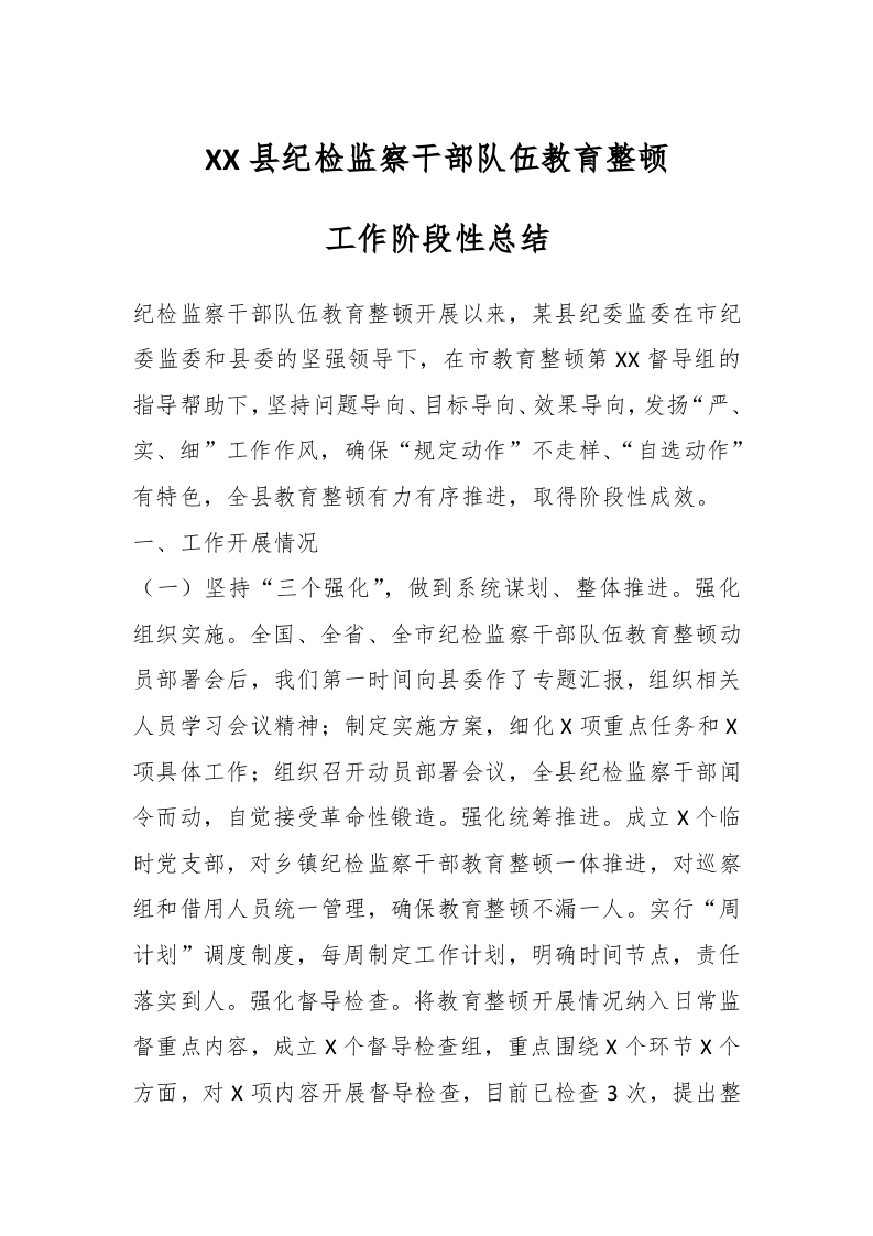 / XX县纪检监察干部队伍教育整顿工作阶段性总结