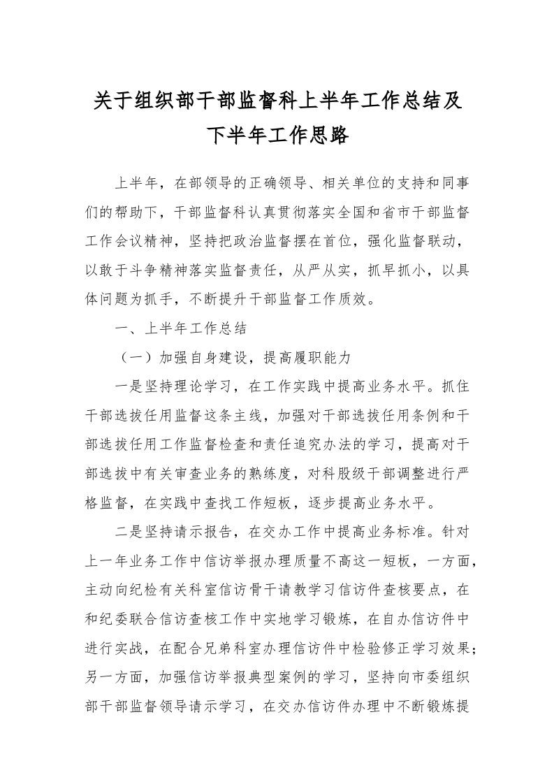 / 关于组织部干部监督科上半年工作总结及下半年工作思路