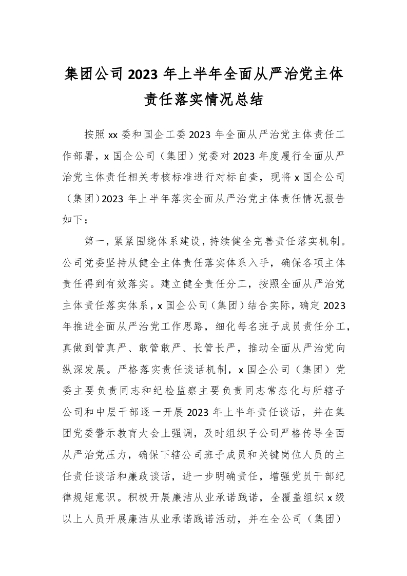 集团公司2023年上半年全面从严治党主体责任落实情况总结