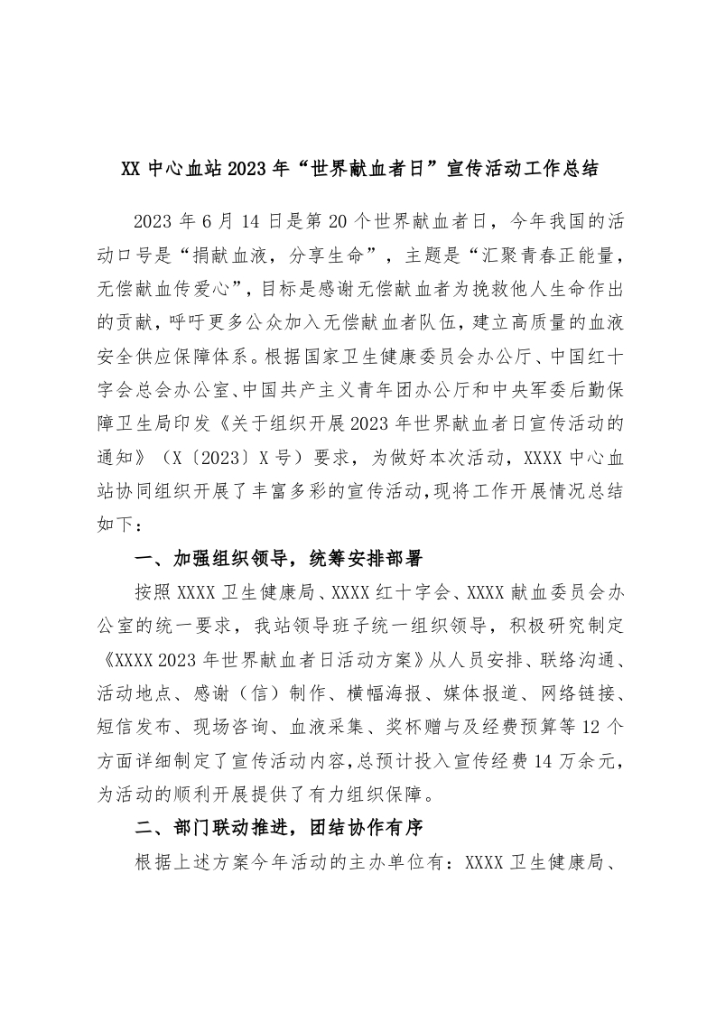 / XX中心血站2023年“世界献血者日”宣传活动工作总结