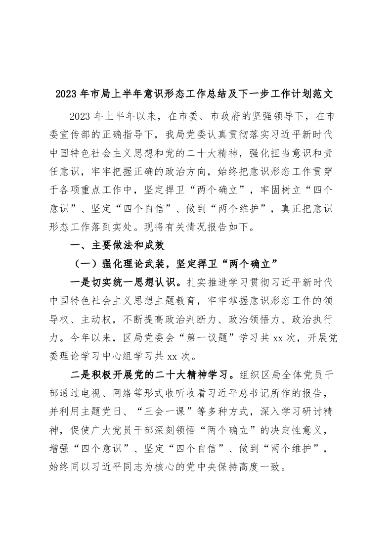 / 2023年市局上半年意识形态工作总结及下步计划汇报报告