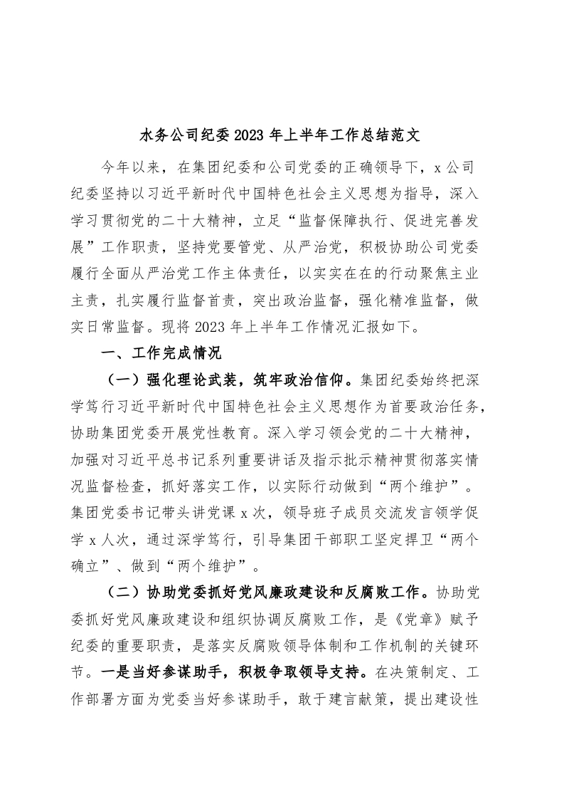 / 水务公司纪委2023年上半年工作总结(集团企业纪检监察汇报报告)