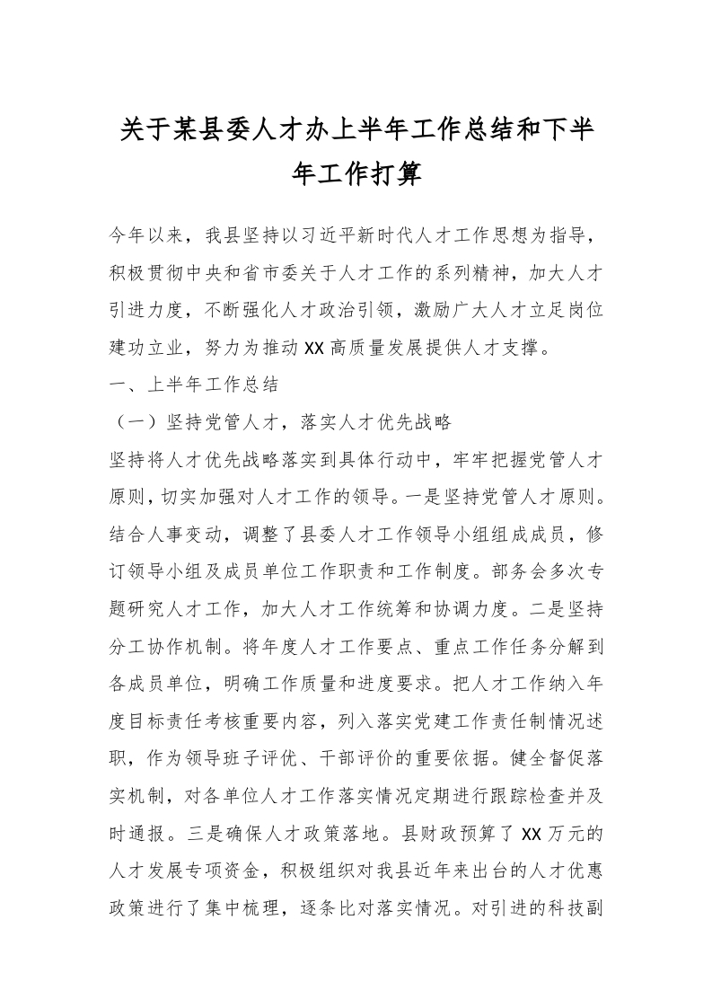 / 关于某县委人才办上半年工作总结和下半年工作打算