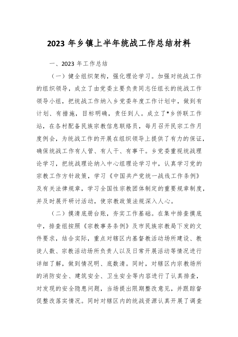 / 2023年乡镇上半年统战工作总结材料