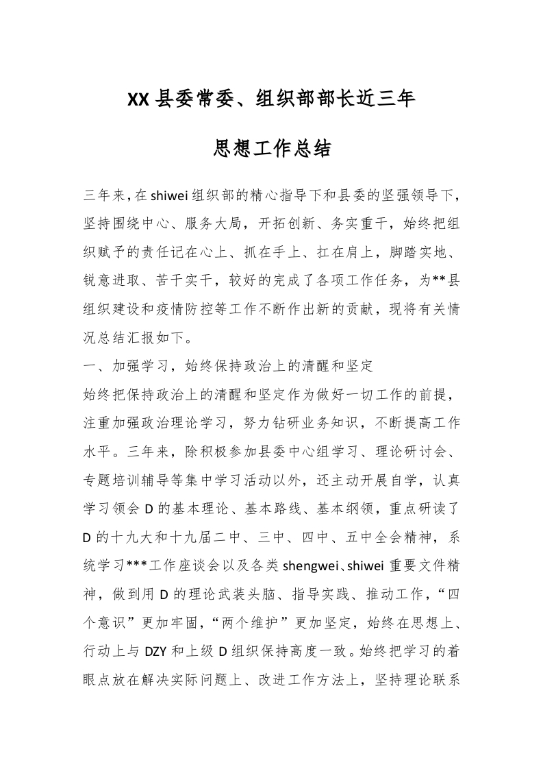 / XX县委常委、组织部部长近三年思想工作总结
