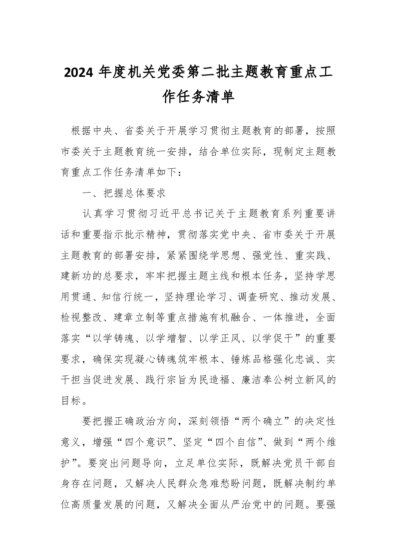 / 2024年度机关党委第二批主题教育重点工作任务清单