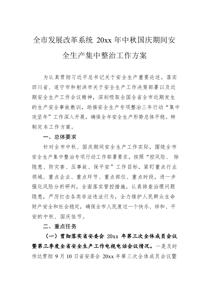 / 全市发展改革系统20xx年中秋国庆期间安全生产集中整治工作方案