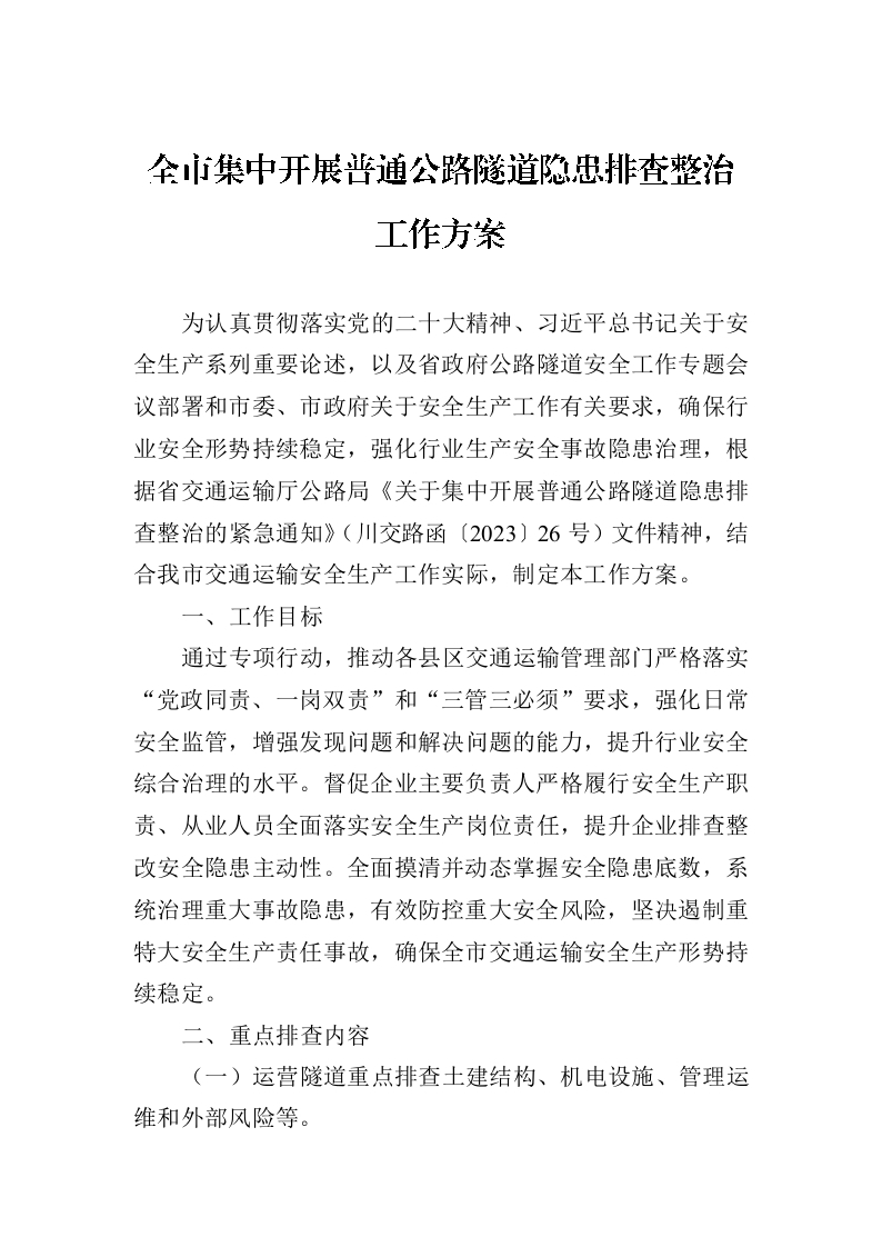 / 全市集中开展普通公路隧道隐患排查整治工作方案(20230625)