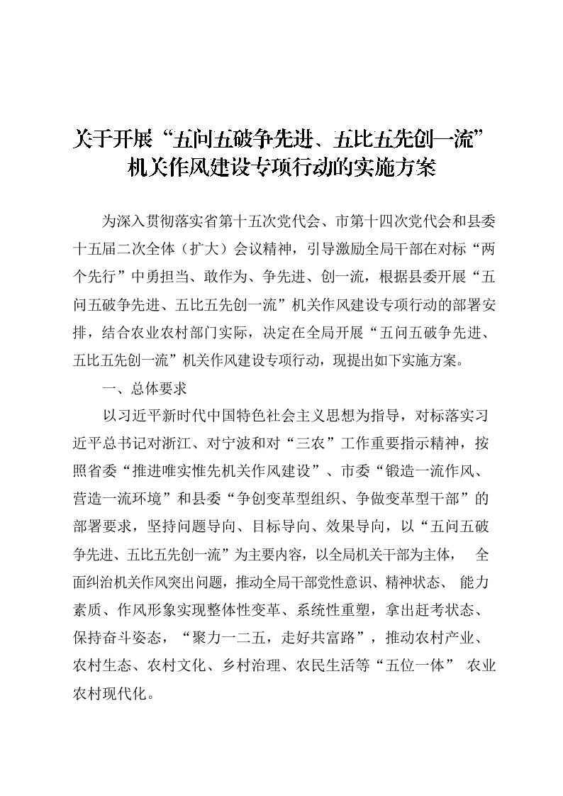 / 关于开展“五问五破争先进、五比五先创一流”机关作风建设专项行动的实施方案