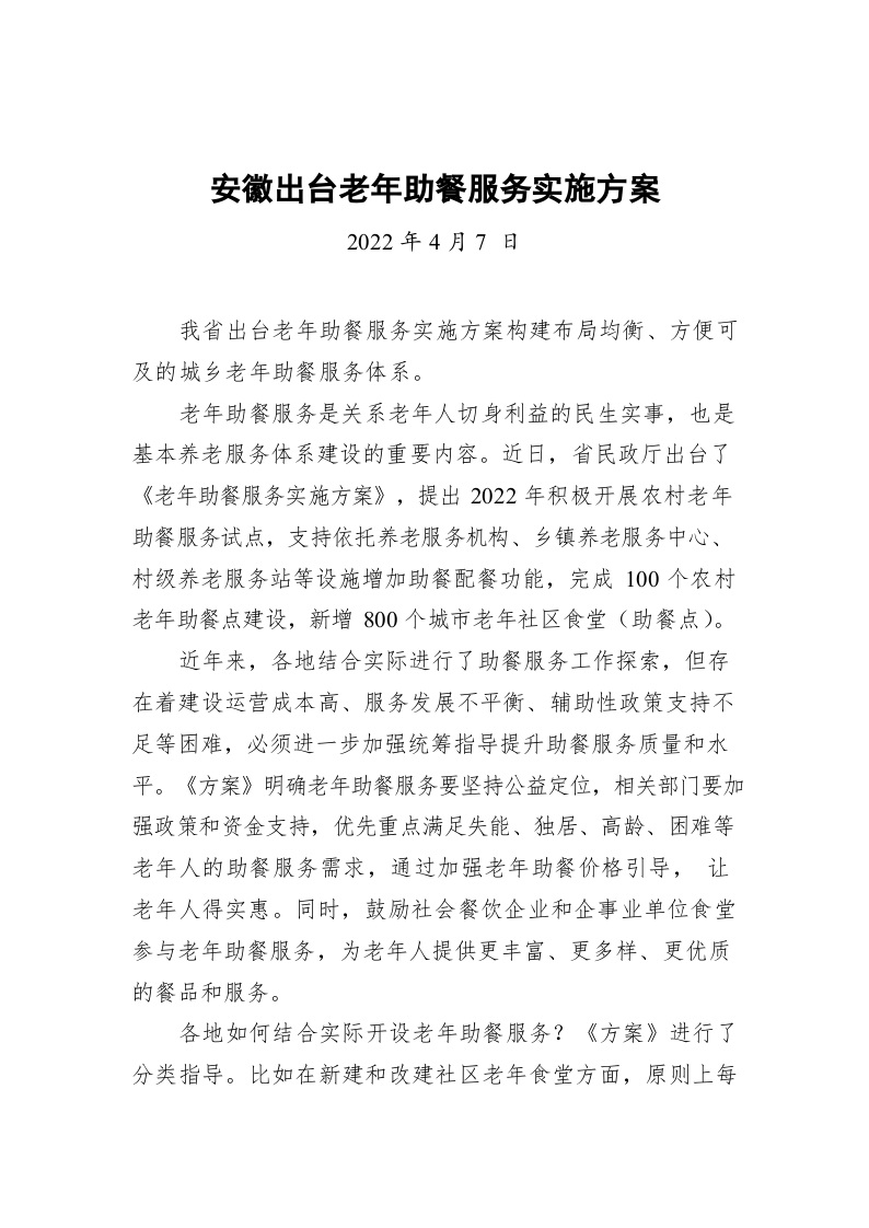 安徽出台老年助餐服务实施方案(20220407)