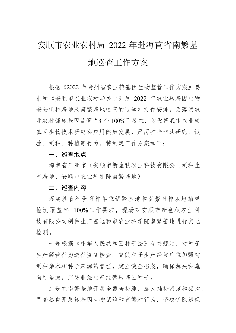 / 安顺市农业农村局2022年赴海南省南繁基地巡查工作方案