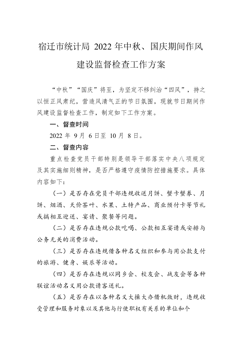 / 宿迁市统计局2022年中秋、国庆期间作风建设监督检查工作方案(20220909)