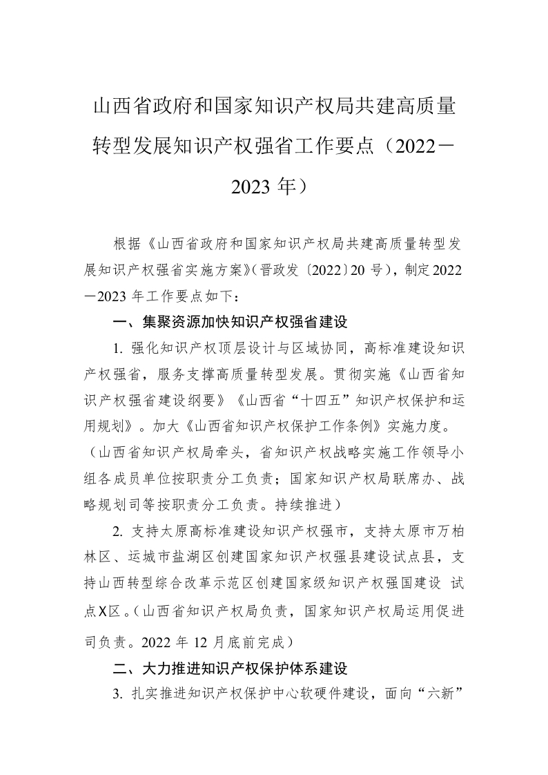 / 山西省政府和国家知识产权局共建高质量转型发展知识产权强省工作要点(2022-2023年)