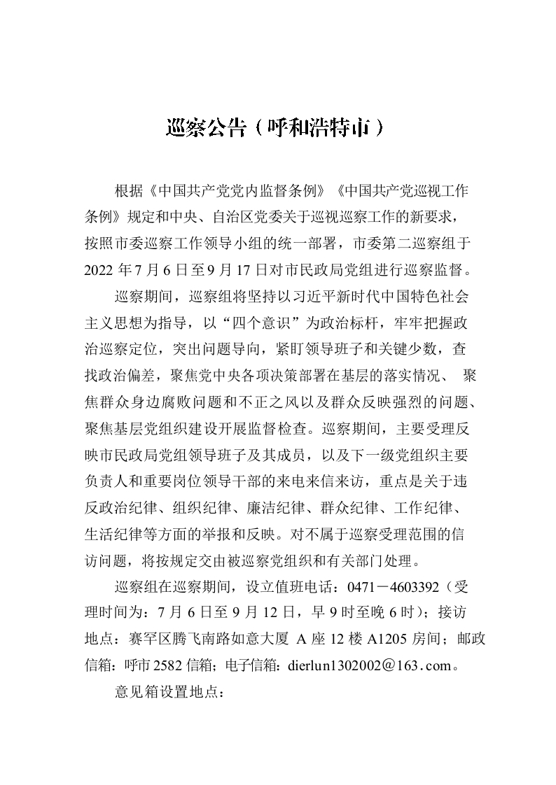 巡察公告(呼和浩特市)