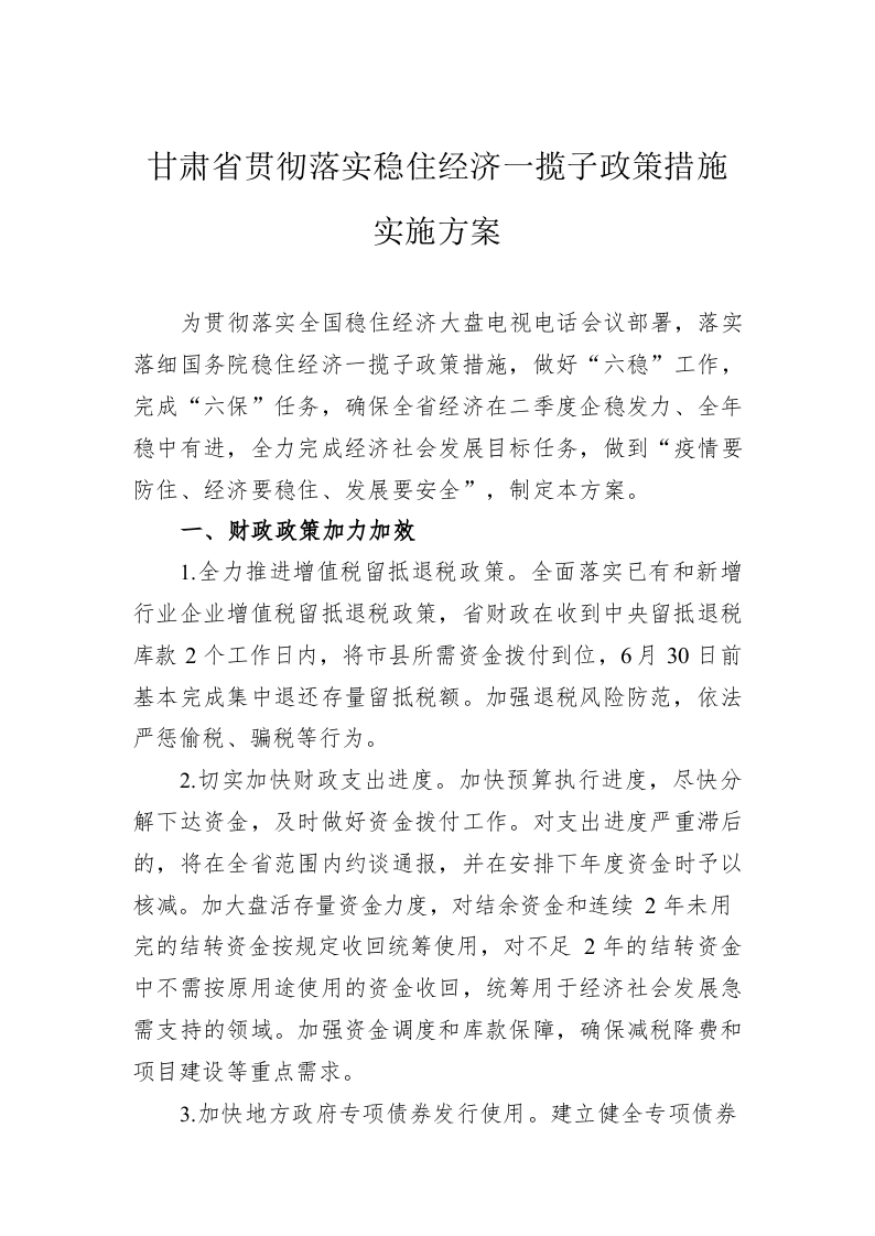 甘肃省贯彻落实稳住经济一揽子政策措施实施方案(20220608)