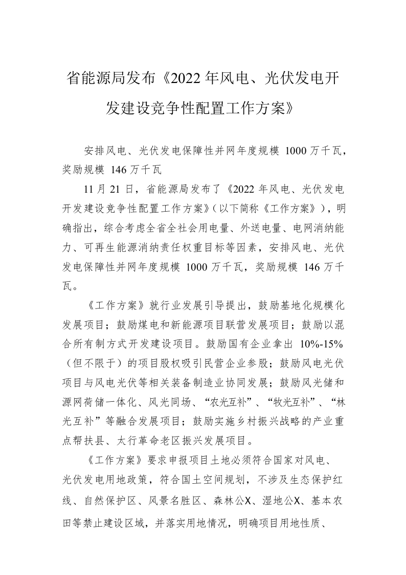 / 省能源局发布《2022年风电、光伏发电开发建设竞争性配置工作方案》