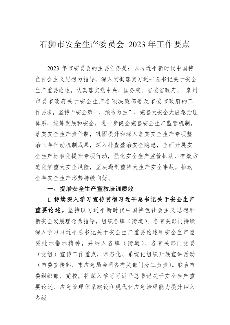 / 石狮市安全生产委员会2023年工作要点