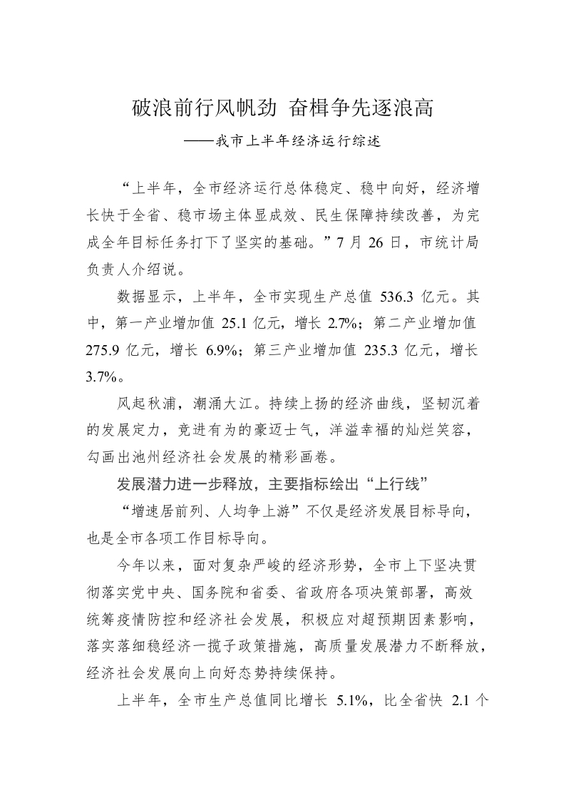 / 破浪前行风帆劲 奋楫争先逐浪高——我市上半年经济运行综述