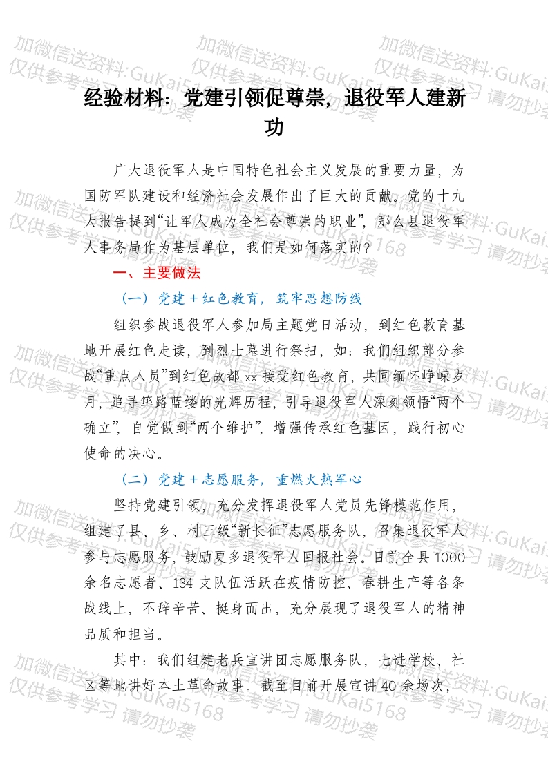 / 经验材料:党建引领促尊崇,退役军人建新功