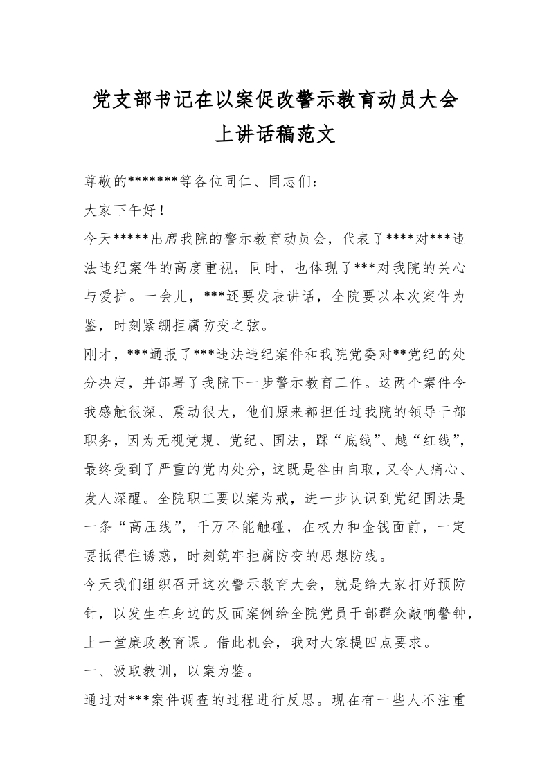 / 党支部书记在以案促改警示教育动员大会上讲话稿范文