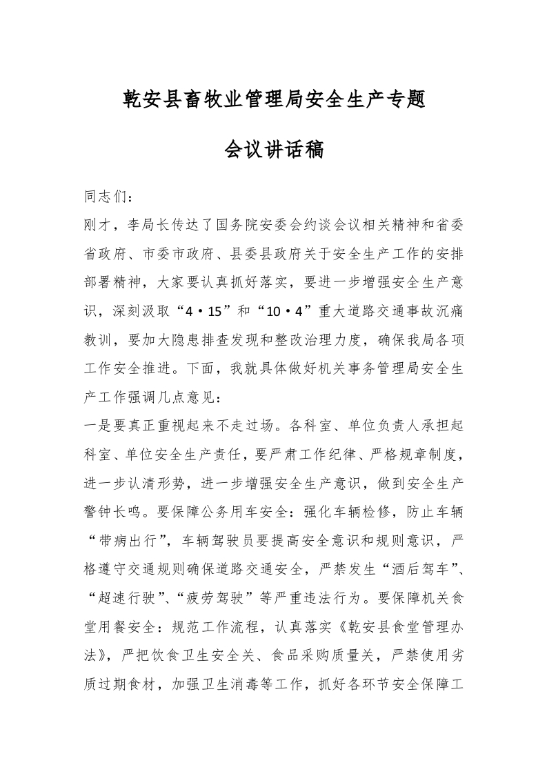 / 乾安县畜牧业管理局安全生产专题会议讲话稿
