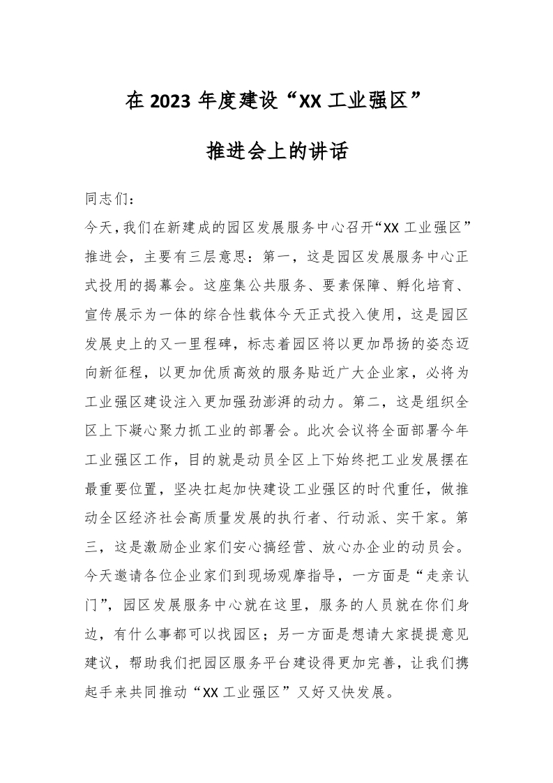 / 在2023年度建设“XX工业强区”推进会上的讲话
