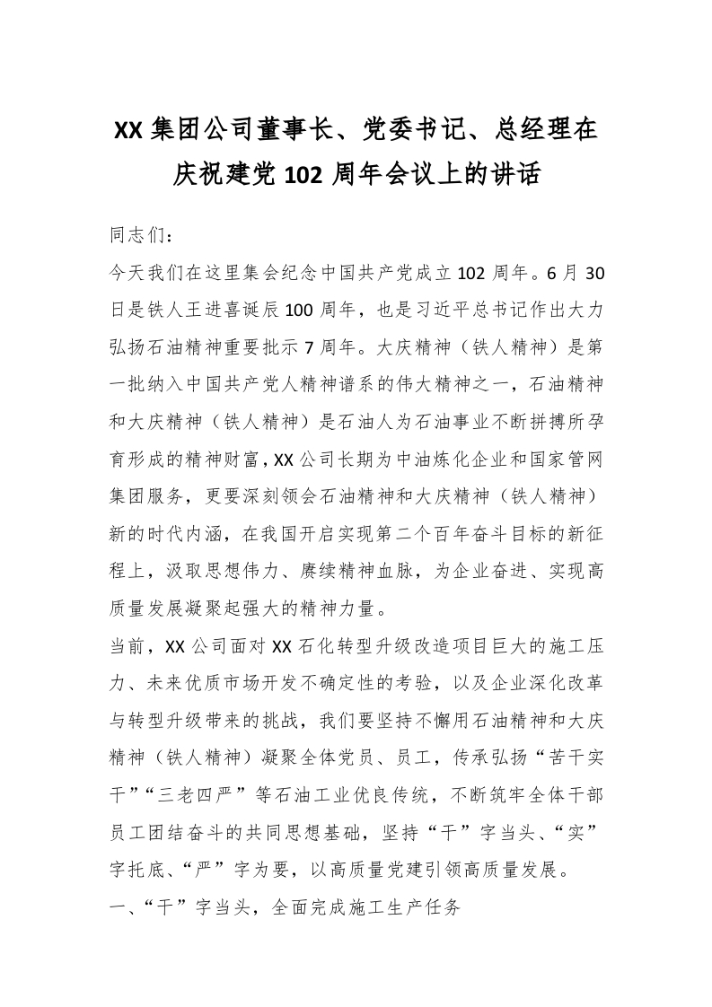 / XX集团公司董事长、党委书记、总经理在庆祝建党102周年会议上的讲话