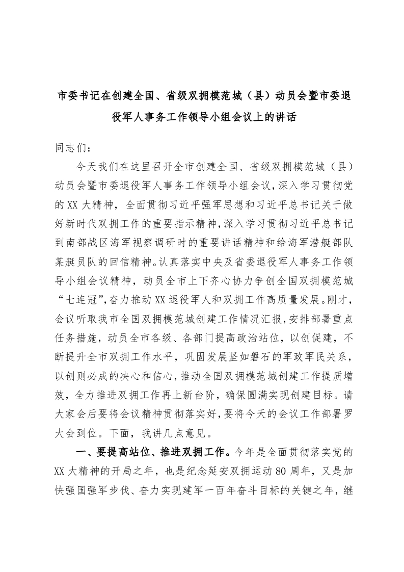 / 市委书记在创建全国、省级双拥模范城(县)动员会暨市委退役军人事务工作领导小组会议上的讲话