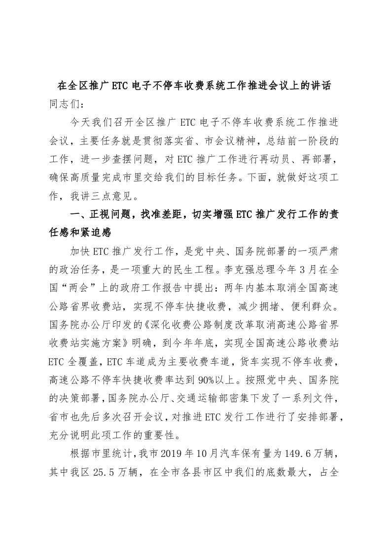 / 在全区推广ETC电子不停车收费系统工作推进会议上的讲话