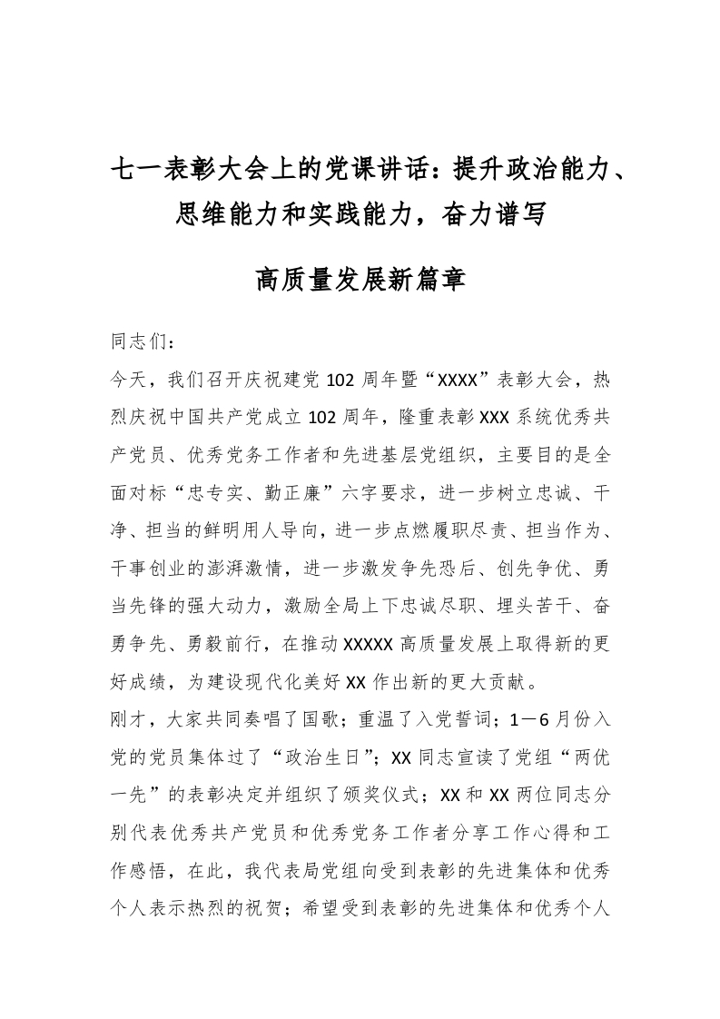 / 七一表彰大会上的党课讲话:提升政治能力、思维能力和实践能力,奋力谱写高质量发展新篇章.