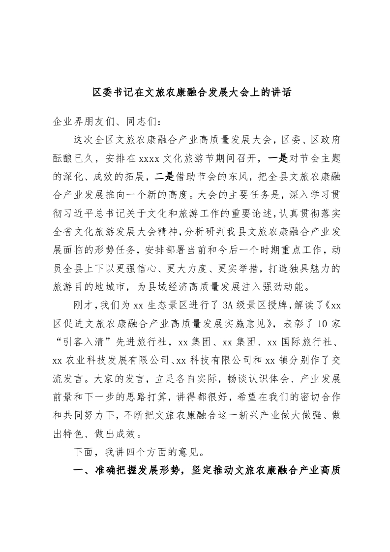 / 区委书记在文旅农康融合发展大会上的讲话_