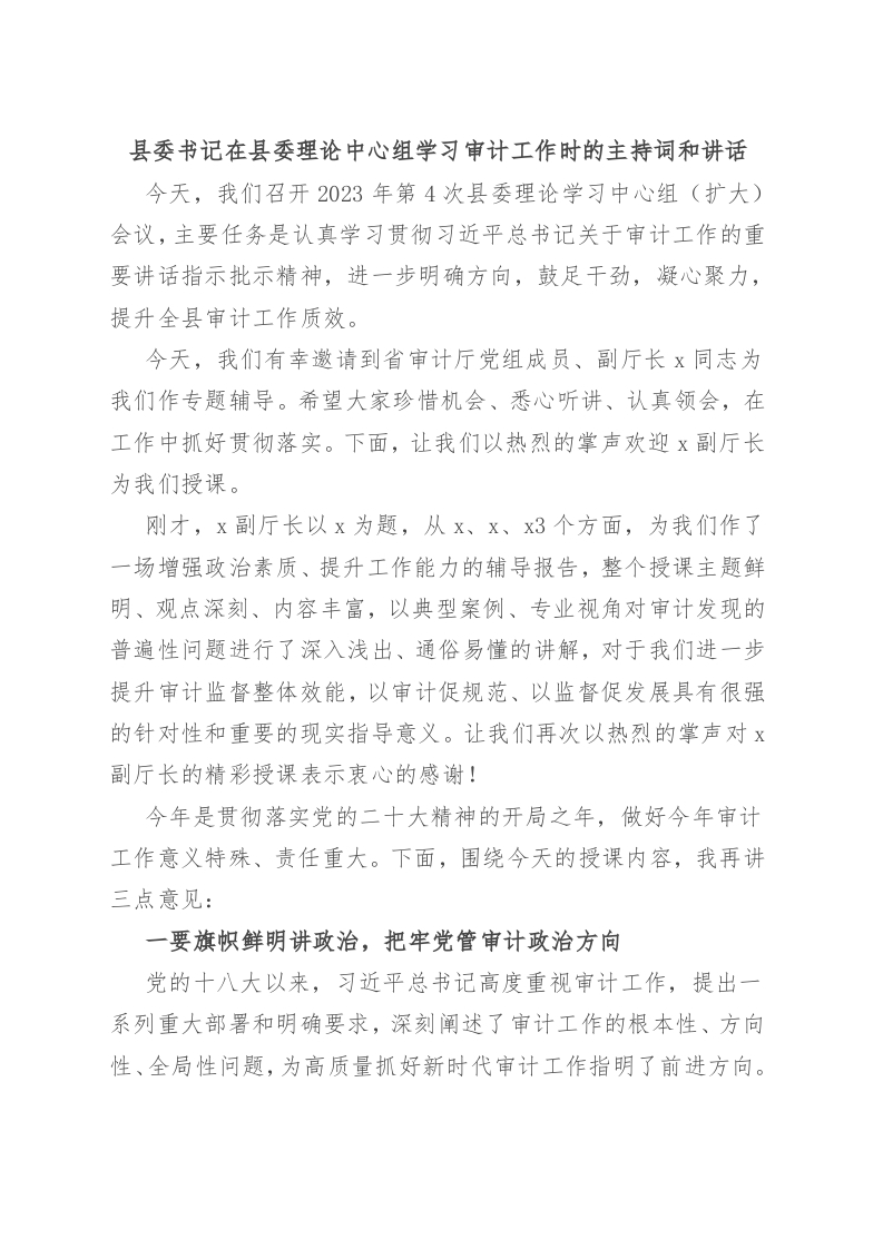 / 县委书记在县委理论中心组学习审计工作时的主持词和讲话