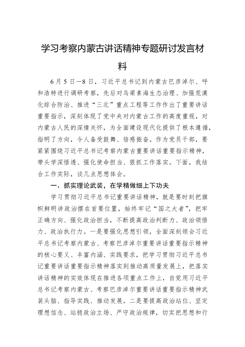 / 学习考察内蒙古讲话精神专题研讨发言材料