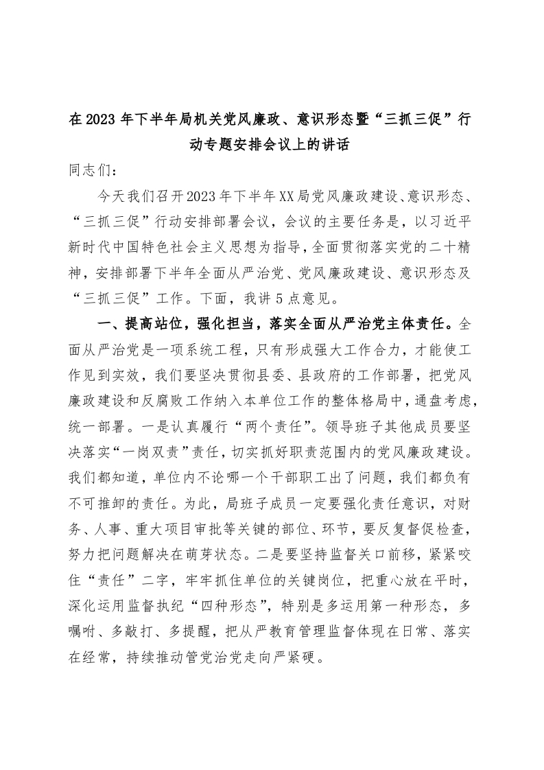 / 在2023年下半年局机关党风廉政、意识形态暨“三抓三促”行动专题安排会议上的讲话