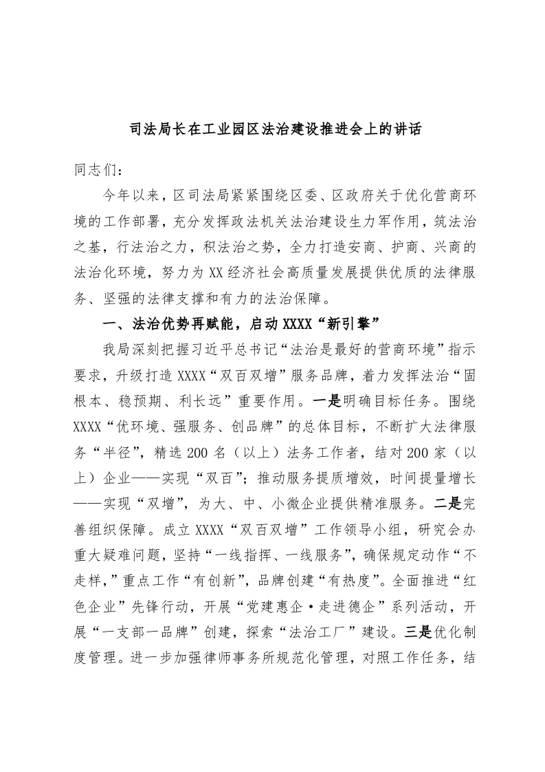 / 司法局长在工业园区法治建设推进会上的讲话