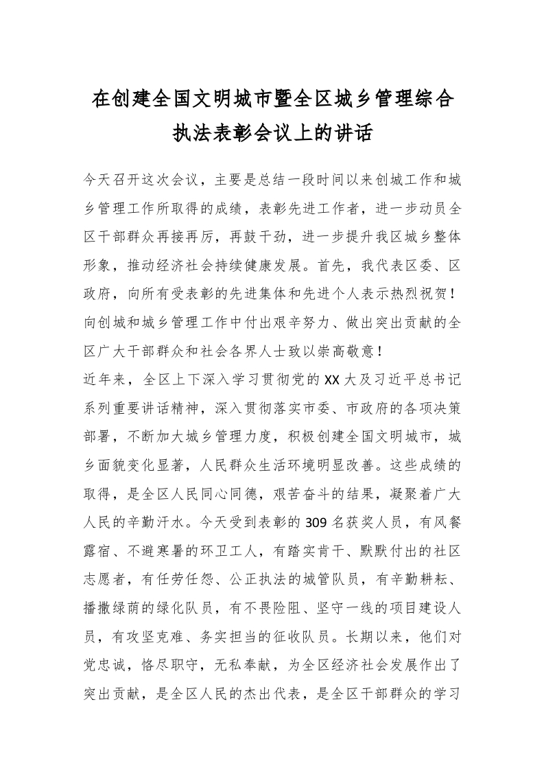 / 在创建全国文明城市暨全区城乡管理综合执法表彰会议上的讲话