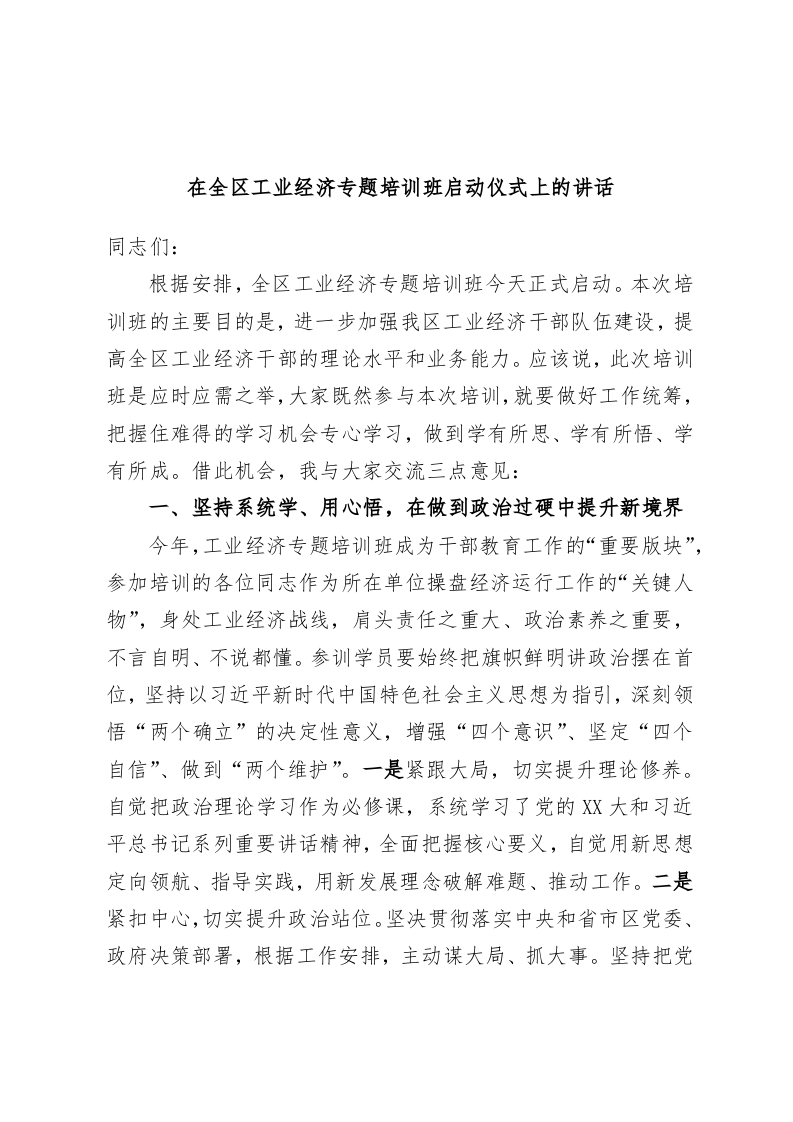 / 在全区工业经济专题培训班启动仪式上的讲话