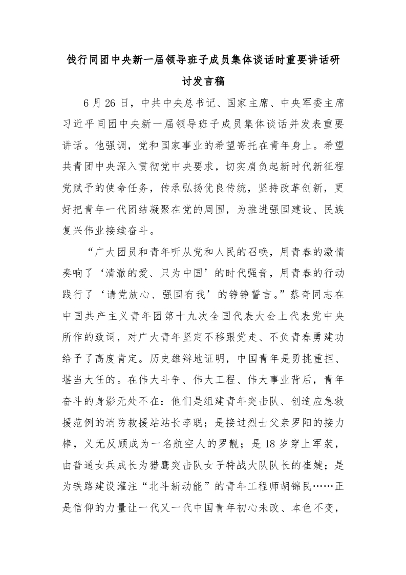 饯行同团中央新一届领导班子成员集体谈话时重要讲话研讨发言稿