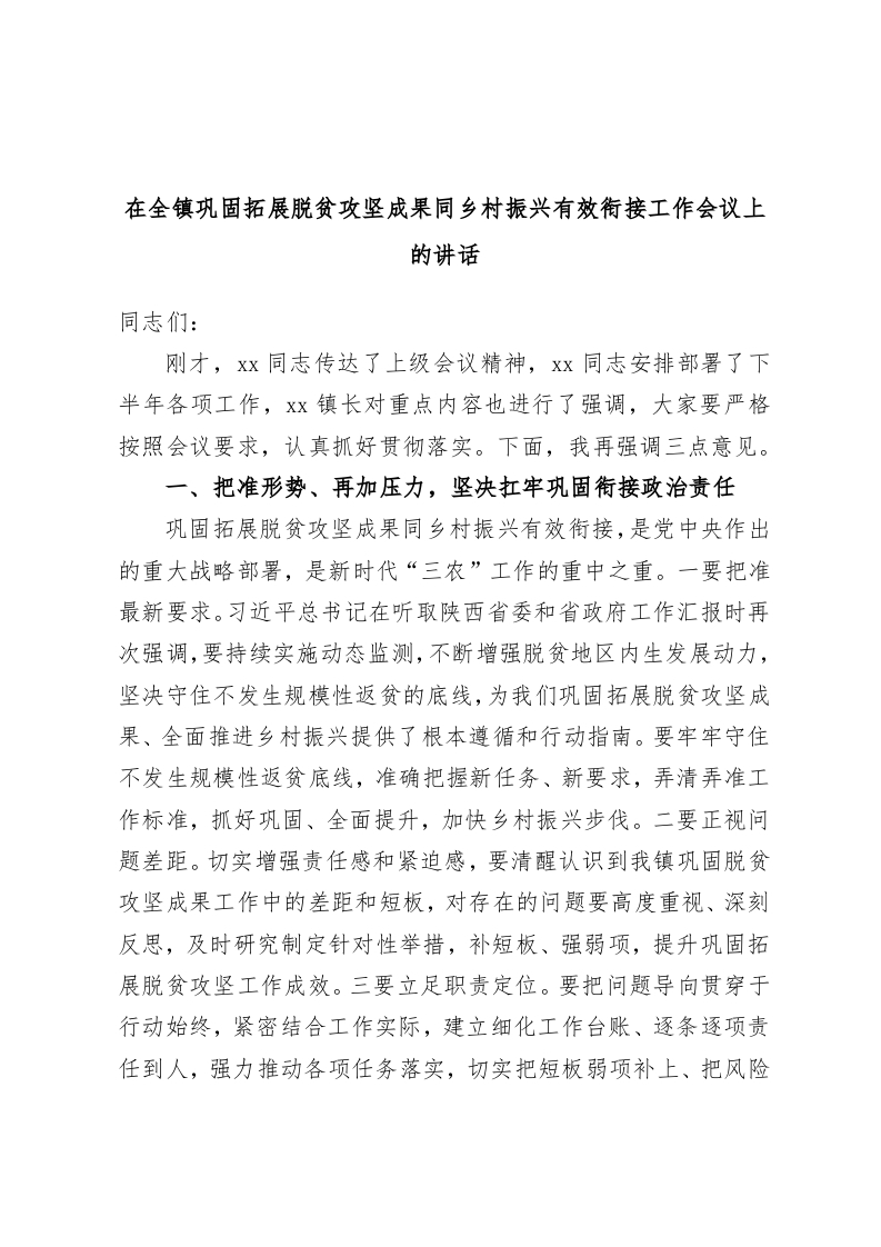 / 在全镇巩固拓展脱贫攻坚成果同乡村振兴有效衔接工作会议上的讲话