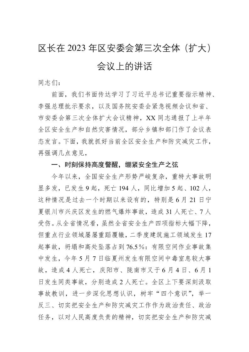 / 区长在2023年区安委会第三次全体(扩大)会议上的讲话